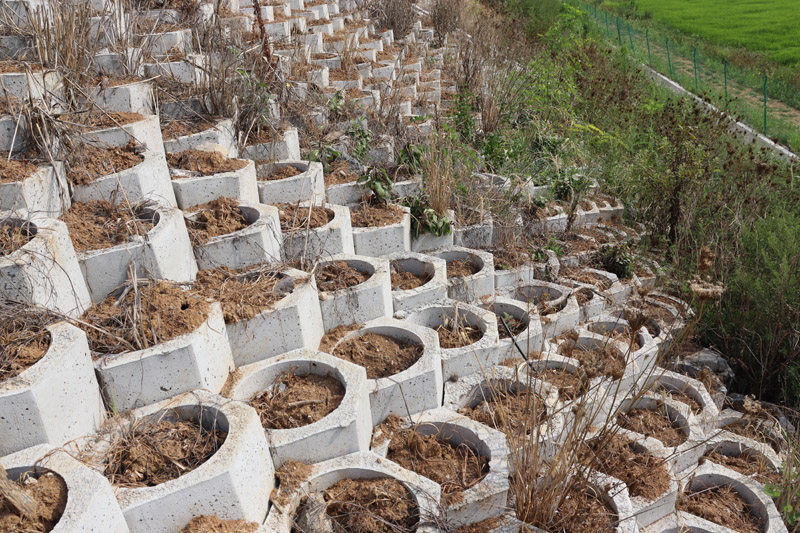 提供植生空間: 磚體上的孔洞、預(yù)留的植生孔或磚塊之間的縫隙,是播種草籽、種植灌木或填充植生基質(zhì)的空間。植物生長后形成“加筋”效應(yīng),進(jìn)一步穩(wěn)固土壤。